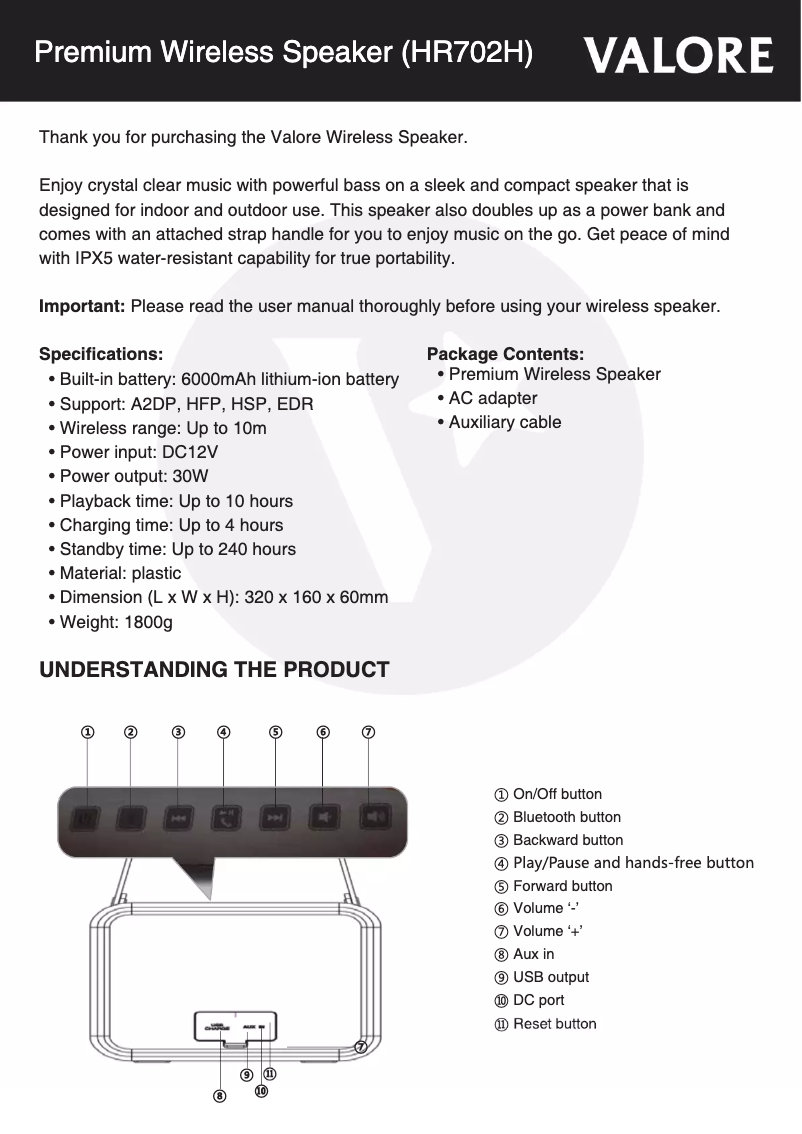 Le HR702H est un produit de la catégorie Audio, plus précisement du type Haut-parleur. Nous avons référencé 1 mode d'emploi du type Manuel utilisateur pour le produit Haut-parleur Valore HR702H. Nous avons également référencé 5 specifications pour le produit Haut-parleur Valore HR702H. Vous avez une question sur le produit Valore HR702H et vous ne trouvez pas la réponse dans le(s) mode(s) d'emploi ? N'hésitez pas à nous contacter.